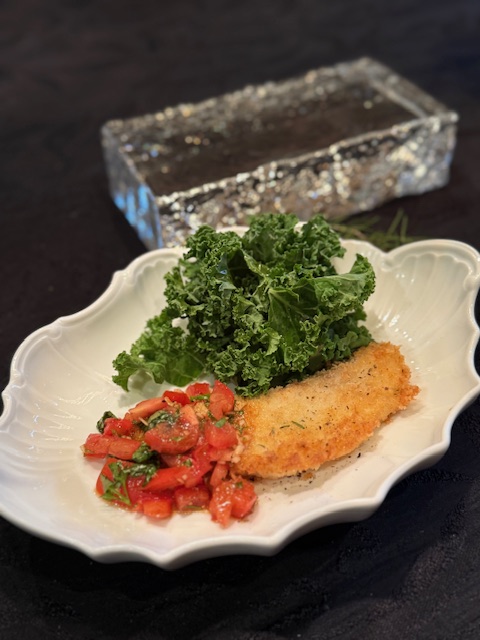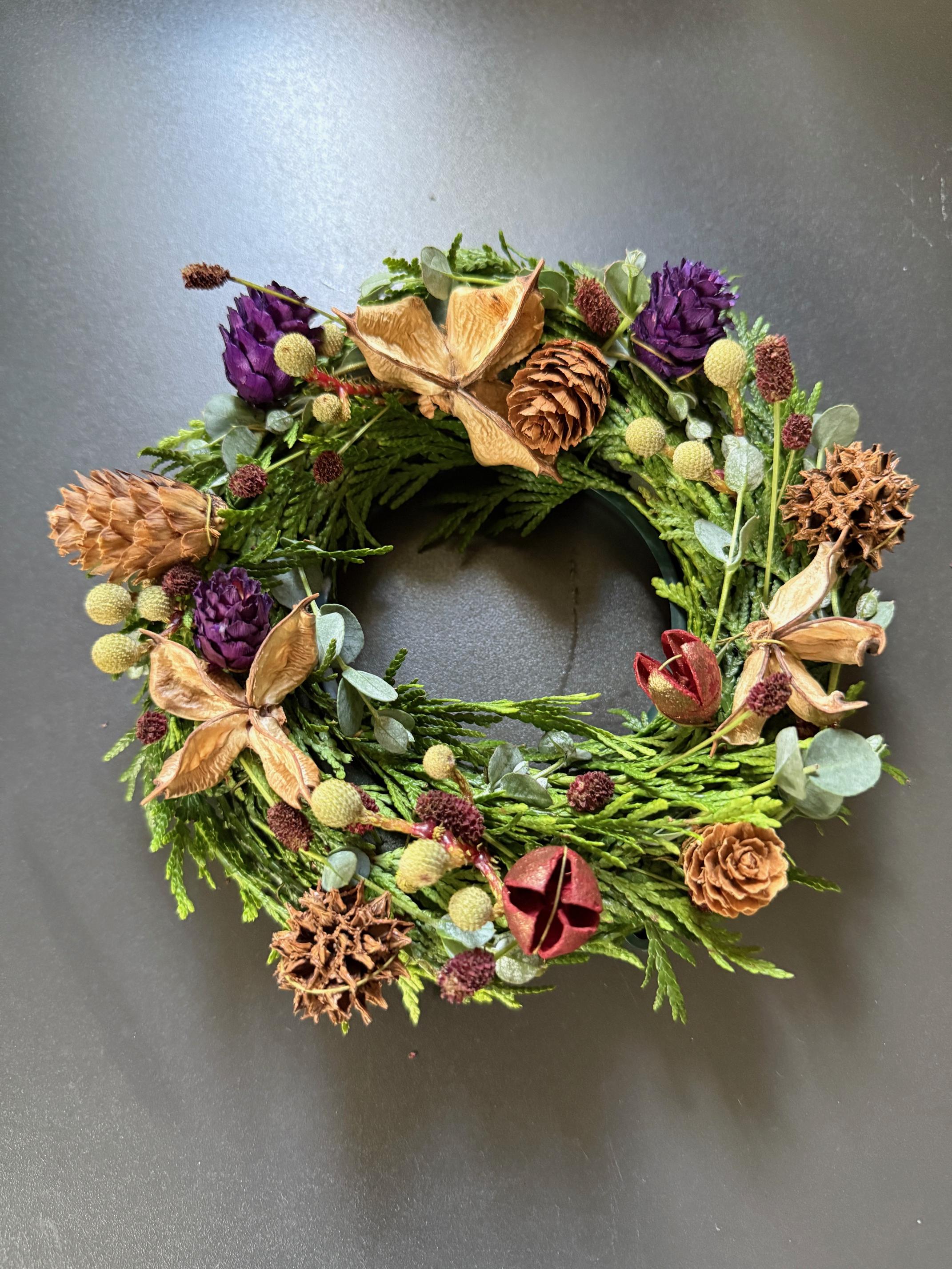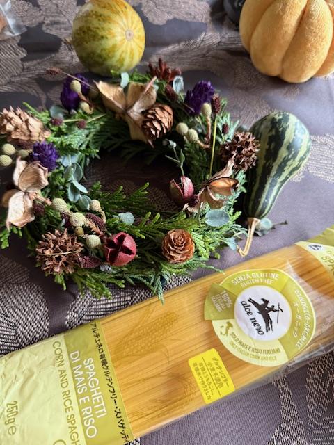 その2。生花クリスマスリースとアルチェネロ・グルテンフリーパスタ料理(パスタお土産つき)、鱈の香草パン粉揚げ焼き、ピクルス、